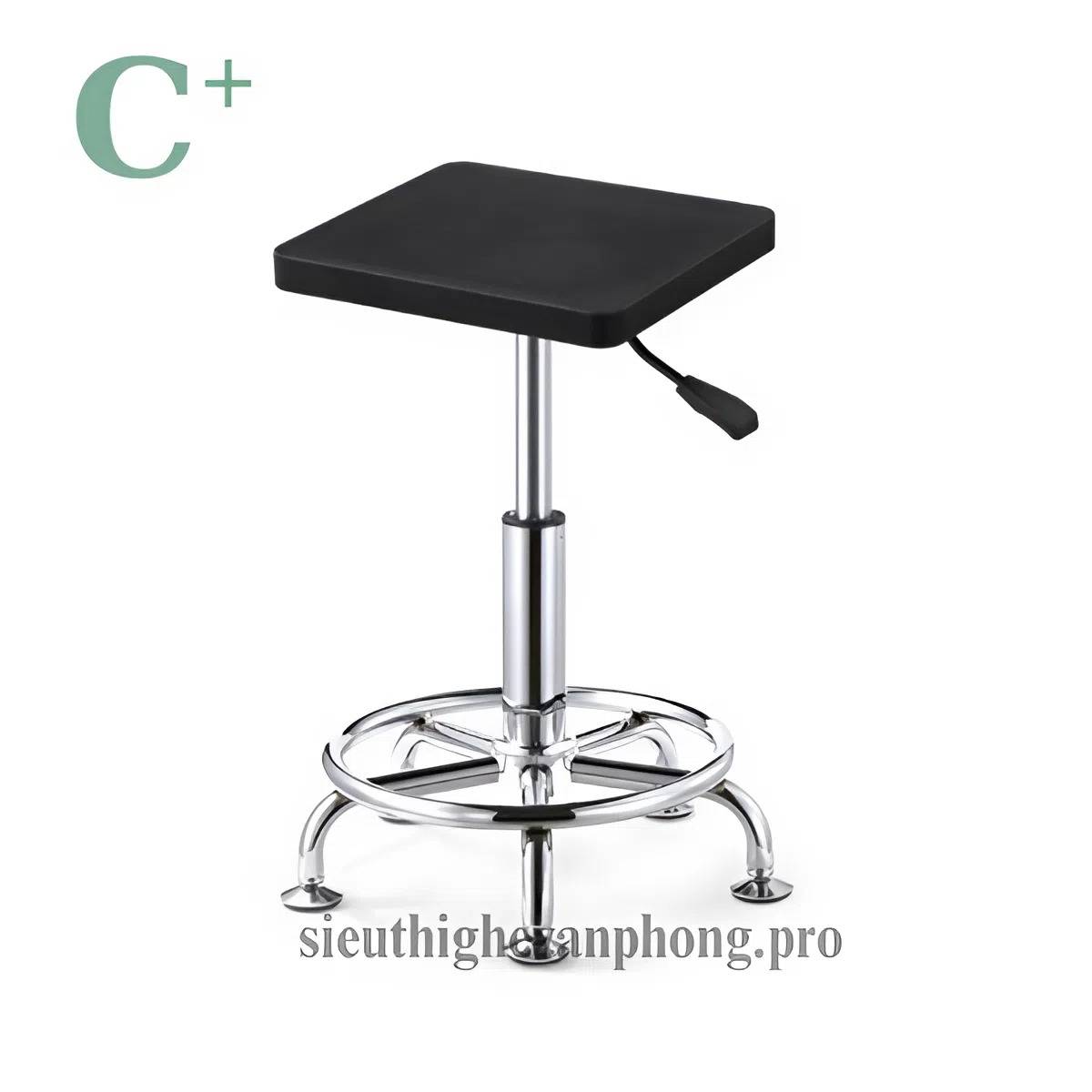 Ghế đôn, không tựa, mặt vuông, khung và chân bằng sắt mạ có bánh xe, xoay 360 độ, có nâng hạ từ 42 đến 54cm, mặt ghế bằng nhựa PU tạo hình vuông.